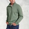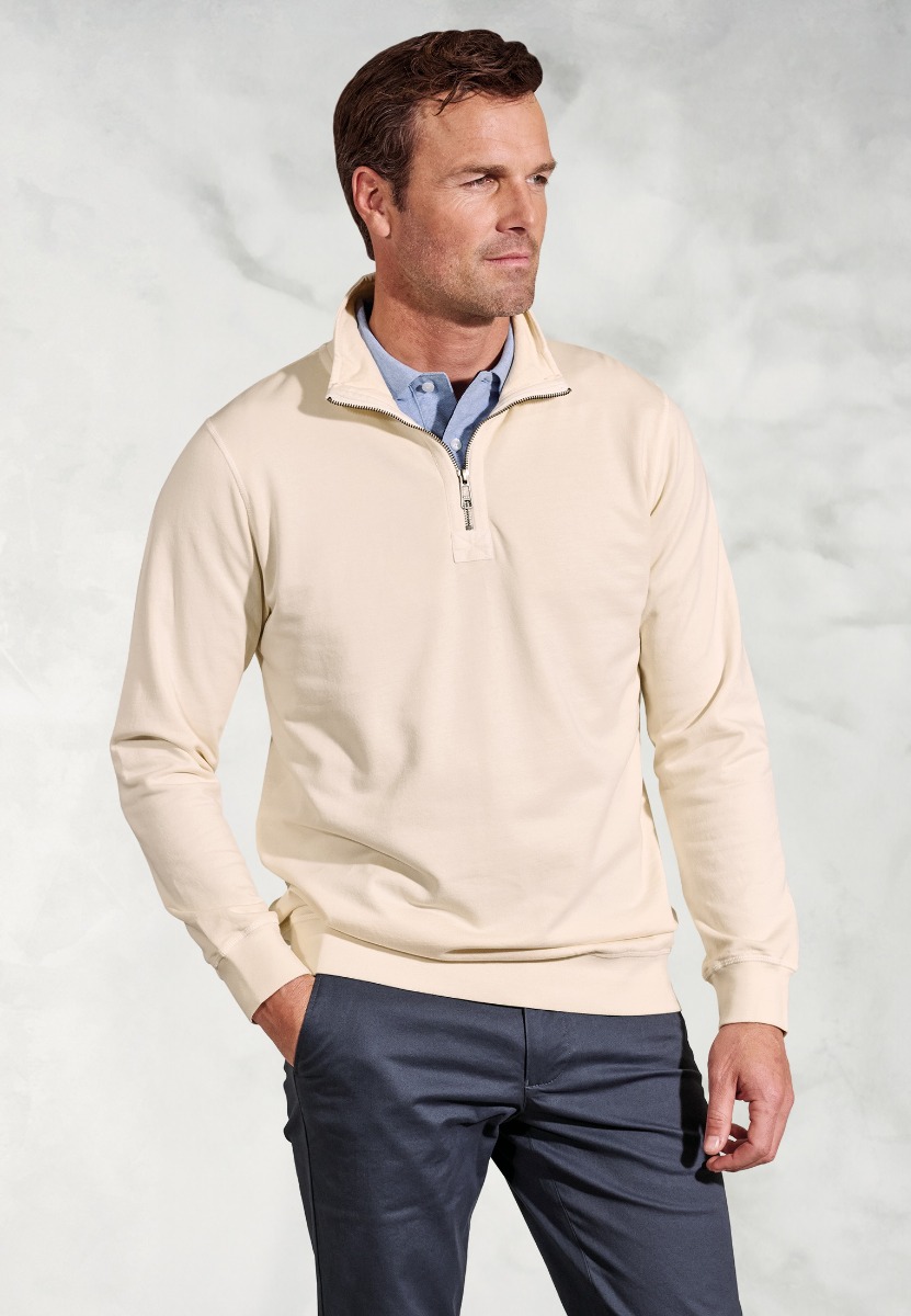 Sweatshirt: Garment dyed. Stand collar. Zip neck fastening. Ribbed cuffs and hem. Open Hem. Side vents. Machine washable.