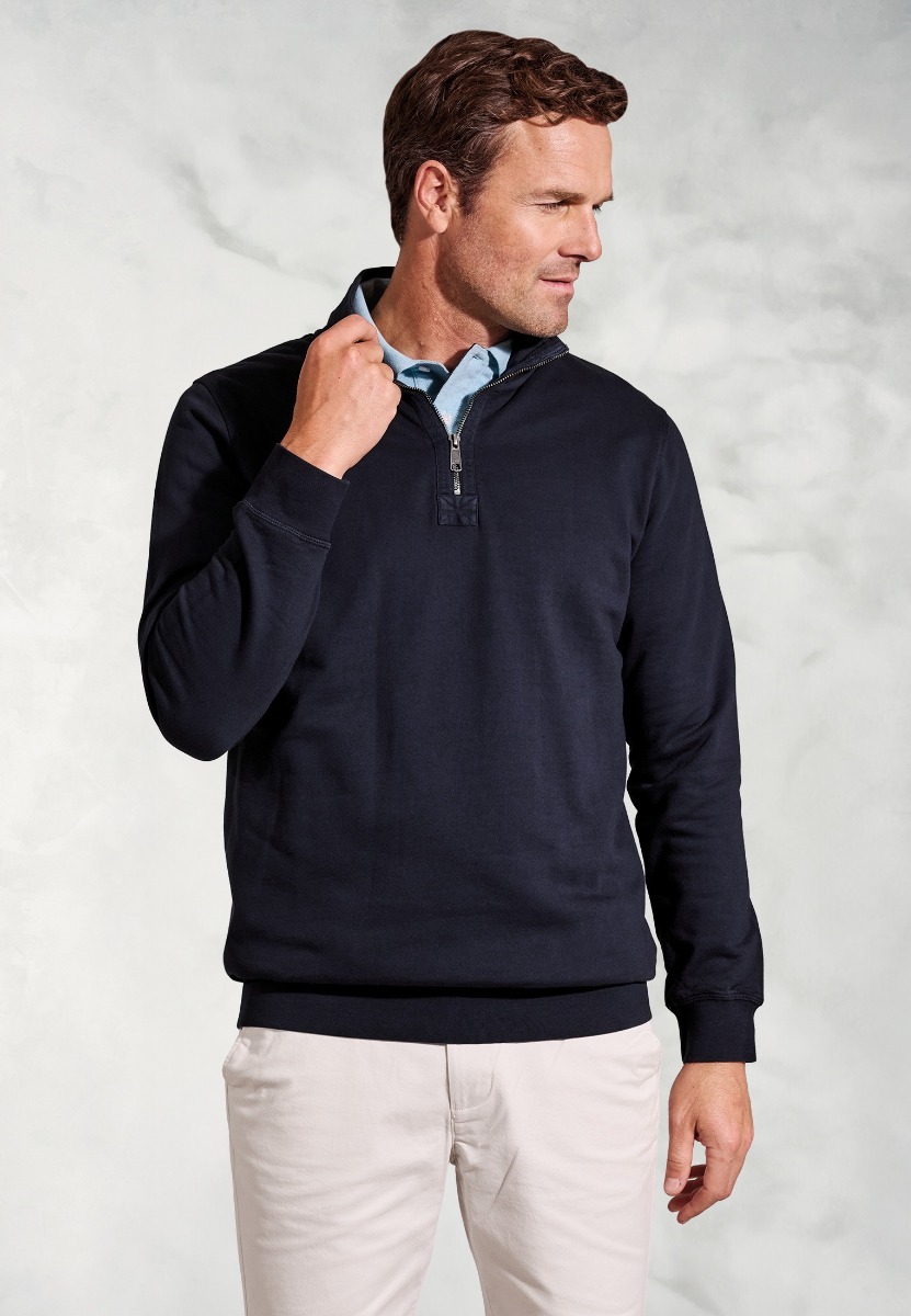 Sweatshirt: Garment dyed. Stand collar. Zip neck fastening. Ribbed cuffs and hem. Open Hem. Side vents. Machine washable.