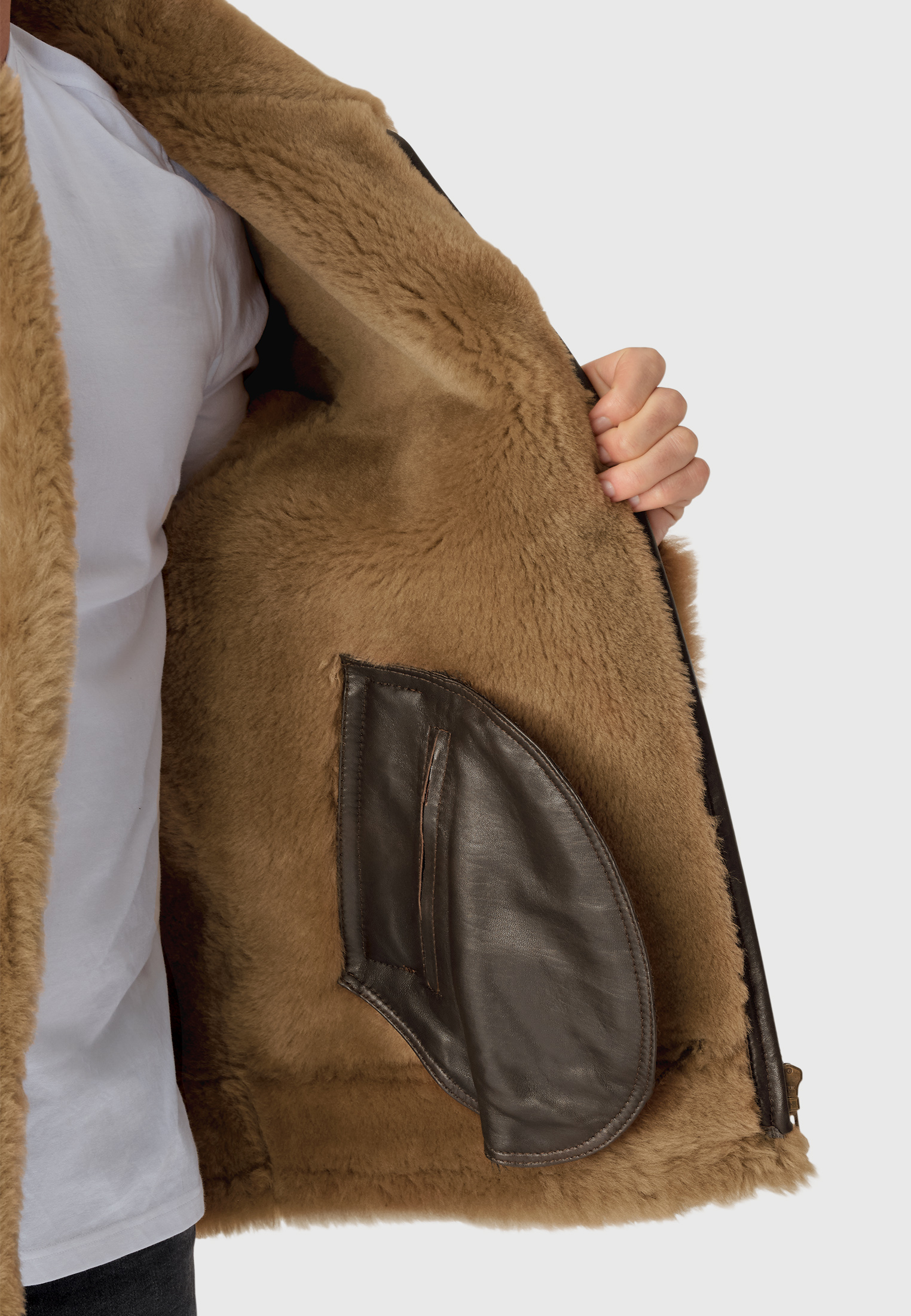 The Cairngorms aviator jacket is made from Sheepskin Napp with a shearling lining, and is available in Brown.