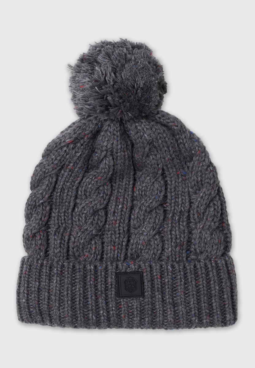 Hat: Cable knit. Ribbed turn-up. Wool pom-pom. Machine washable.