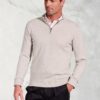 Knitwear: 12 gauge. Fully fashioned. Zip neck. Plain knit. Ribbed neck, hem and cuffs. Machine washable.