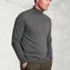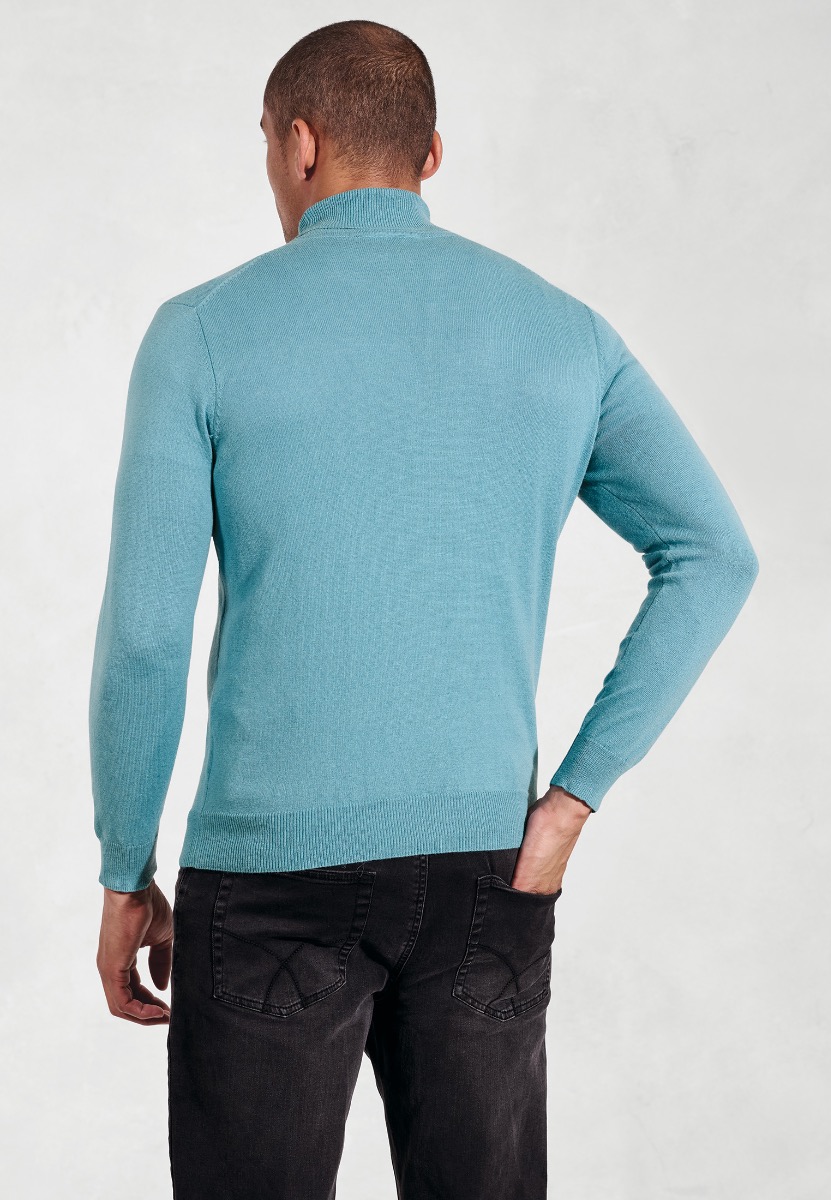 Knitwear: 12 gauge. Roll Neck. Fully fashioned. Plain knit. Ribbed neck, hem and cuffs. Machine washable.