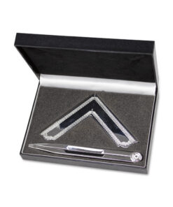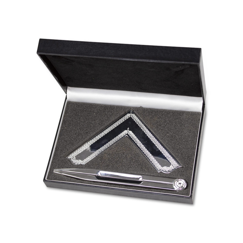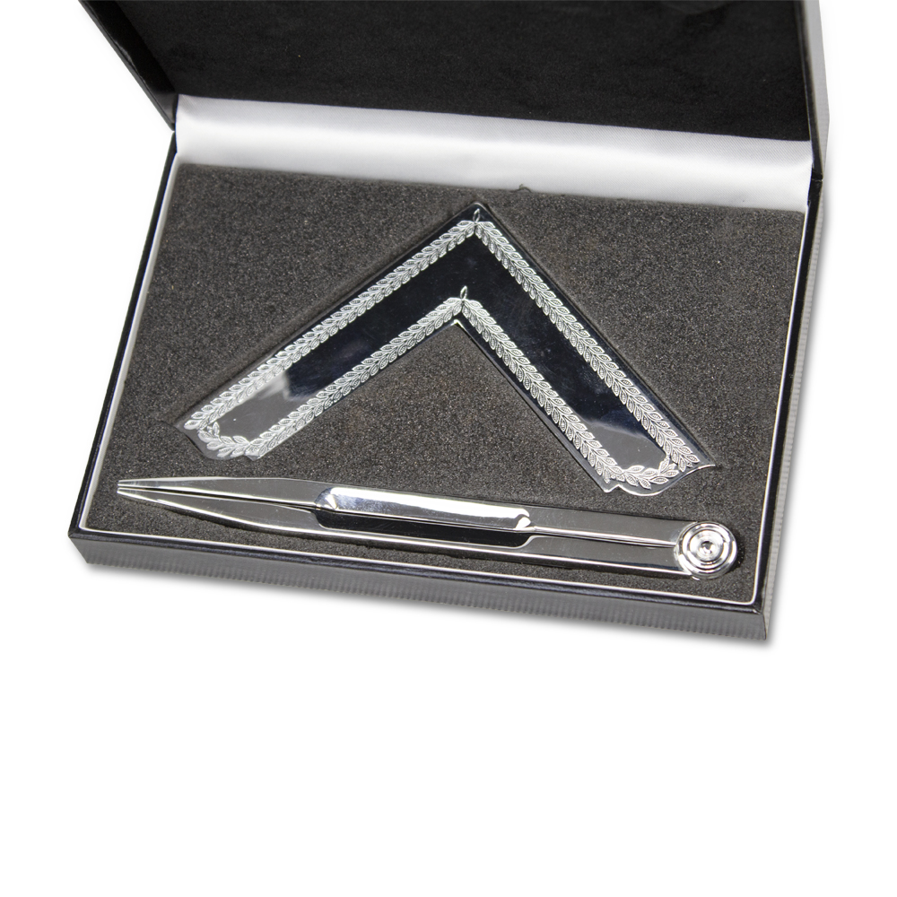 A presentation set of Square & Compasses in silverplated finish and fitted box.