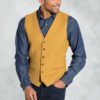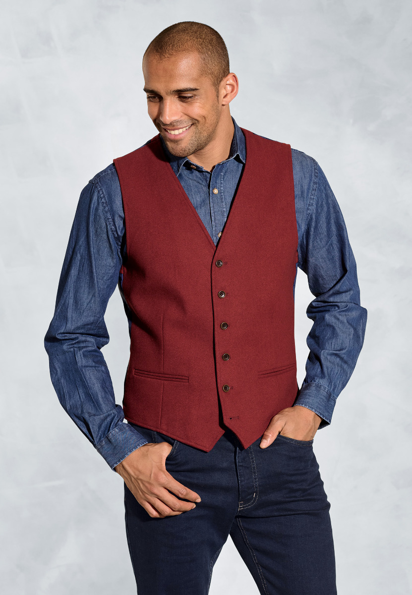 The Dettori waistcoat is made from a polyester and wool blend fabric, and is available in four colours; Red, Red, Mustard and Rust.