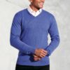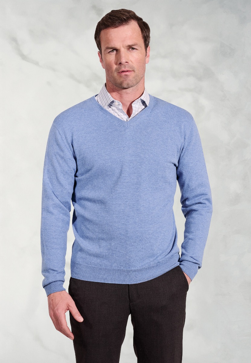 Knitwear: 12 gauge. Fully fashioned. V-neck. Plain knit. Ribbed neck, hem and cuff. Machine washable.