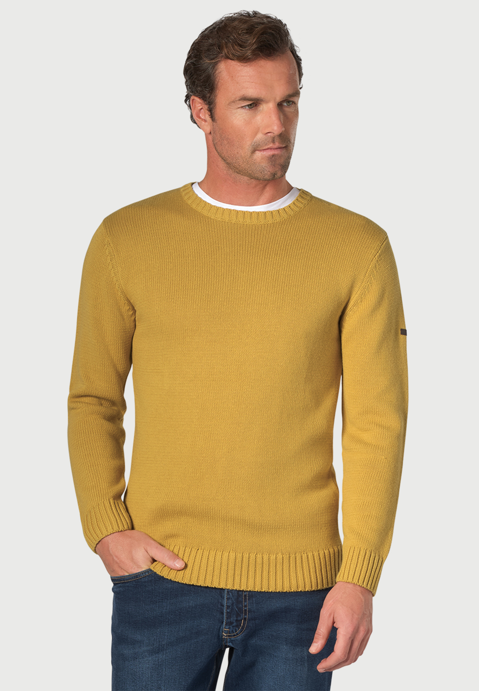 Knitwear: 5 gauge. Crew neck. Ribbed neck, hem and cuffs. Machine washable.
