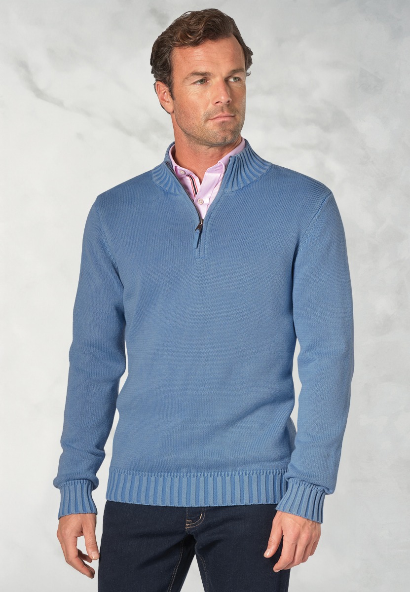 The Edmonds zip neck jumper is made from 100% cotton and is available in four colours; Navy, Red, Blue and Mustard.