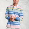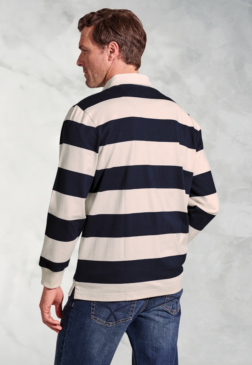 The Farrell rugby shirt is made from cotton, and is available in a Navy Hooped design.