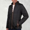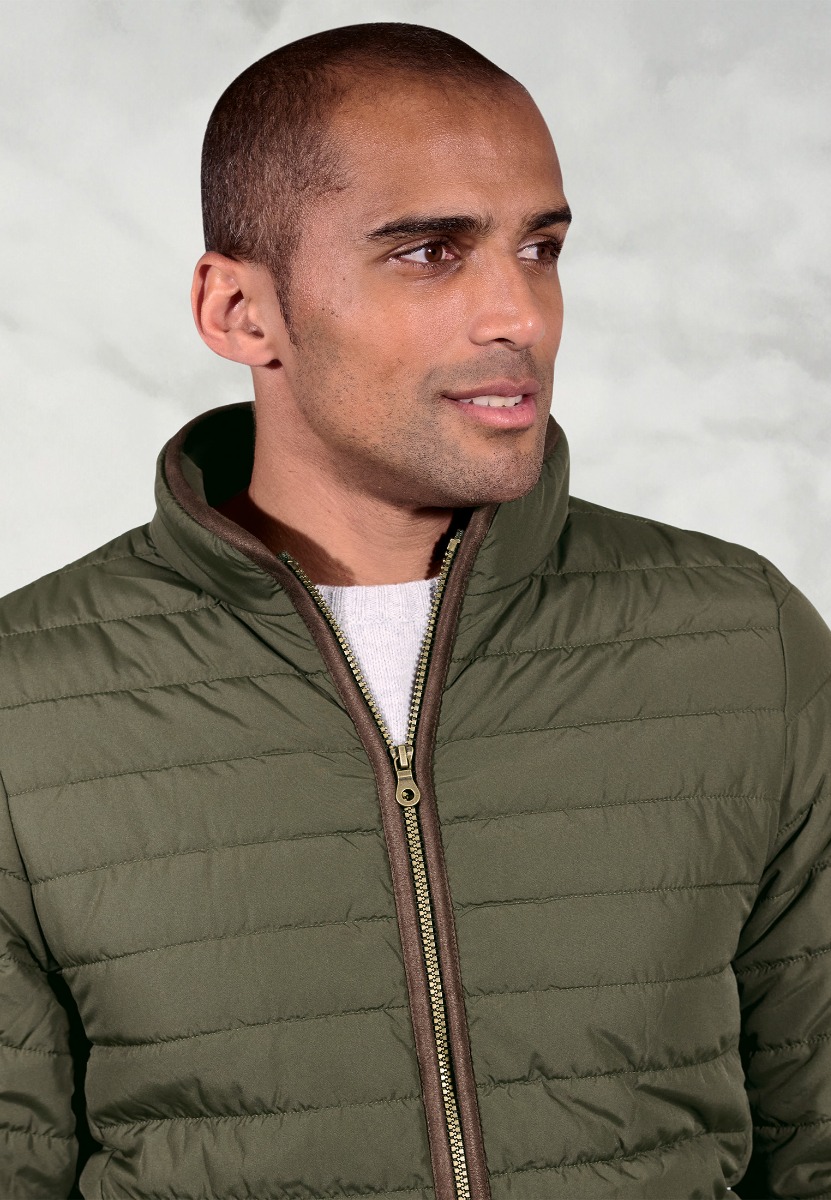 Jacket: Water resistant finish. Horizontal quilting. Stand collar. Zip through fastening. Vertical pockets with zip fastening. One internal pocket with zip fastening. Faux suede binding collar, front and pockets. Drawcord hem with toggle adjustment. Machine washable