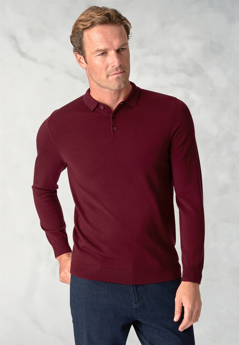 The Plockton polo shirt is knitted from 100% Merino wool and is available in four colours; Navy, Black, Wine and Burnt Orange.