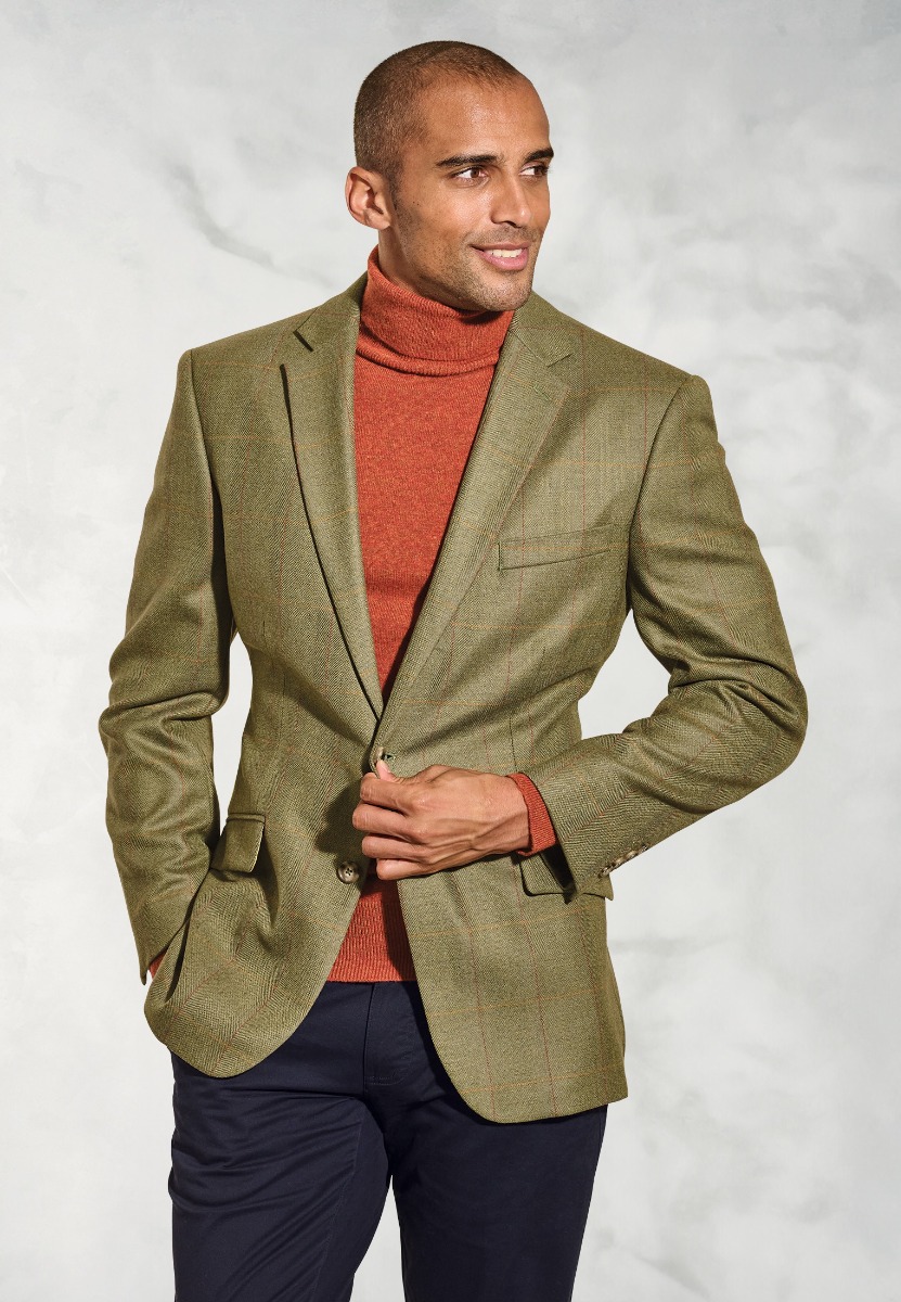 The Helsinki tweed jacket is made from a medium weight tweed pure new wool for all year wear. Available in a regular fitin Olive with Red and Yellow Check.