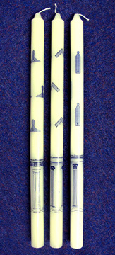 Wax candles for Craft lodge use. A pack of one complete set total of 3 candles). Emblamatic WM SW JW Motifs.