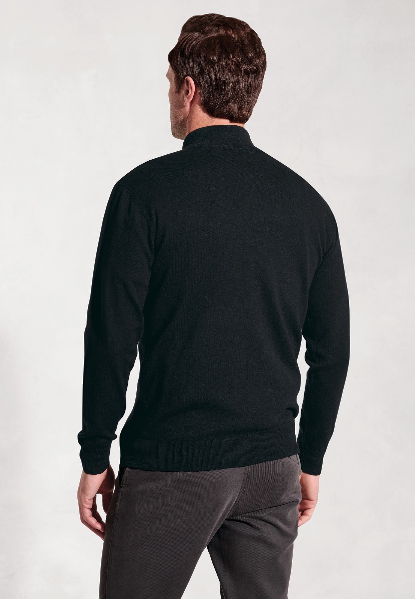 Knitwear: 12 gauge. Fully fashioned. Zip neck fastening. Plain knit. Ribbed neck, hem and cuff. Machine washable.