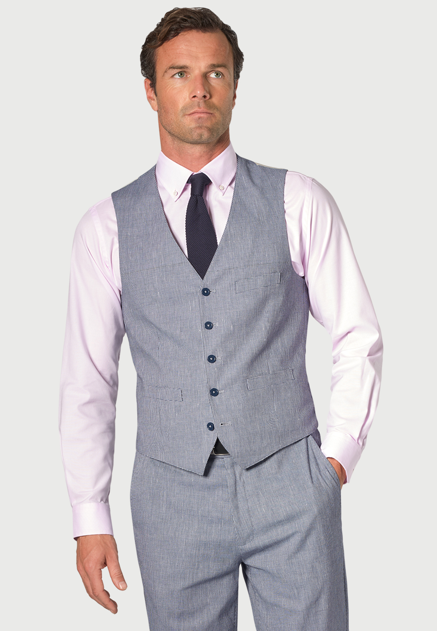 The Anderson suit is tailored fit, made from a cotton linen blend fabric and is available in Blue Puppytooth.
