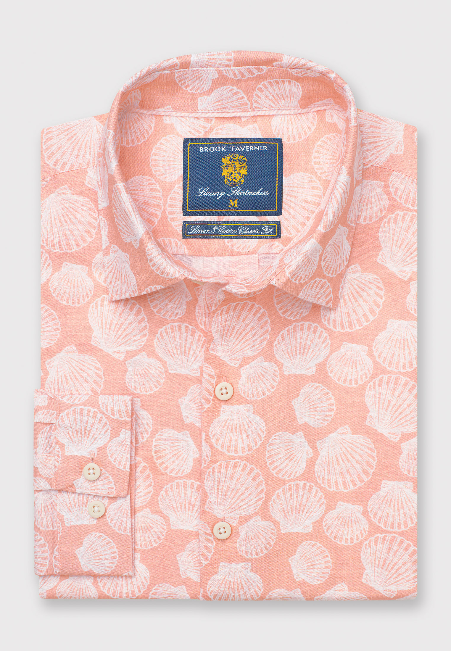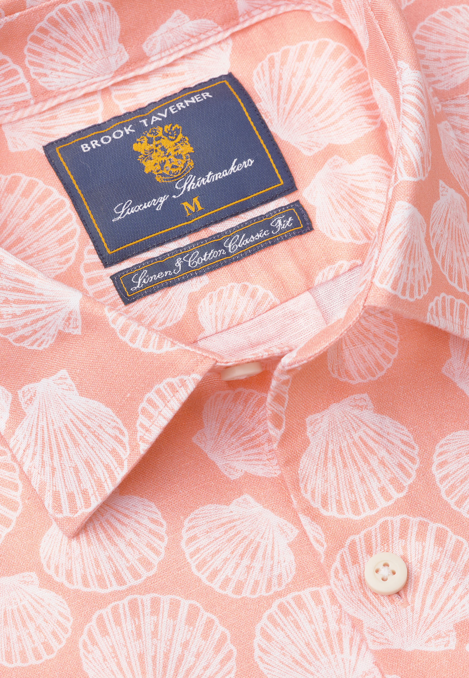 Made from a linen cotton fabric in Regular and tailored fit, and available in two printed designs: Pastel Apricot with Clams; and Pastel Blue with Seahorses.