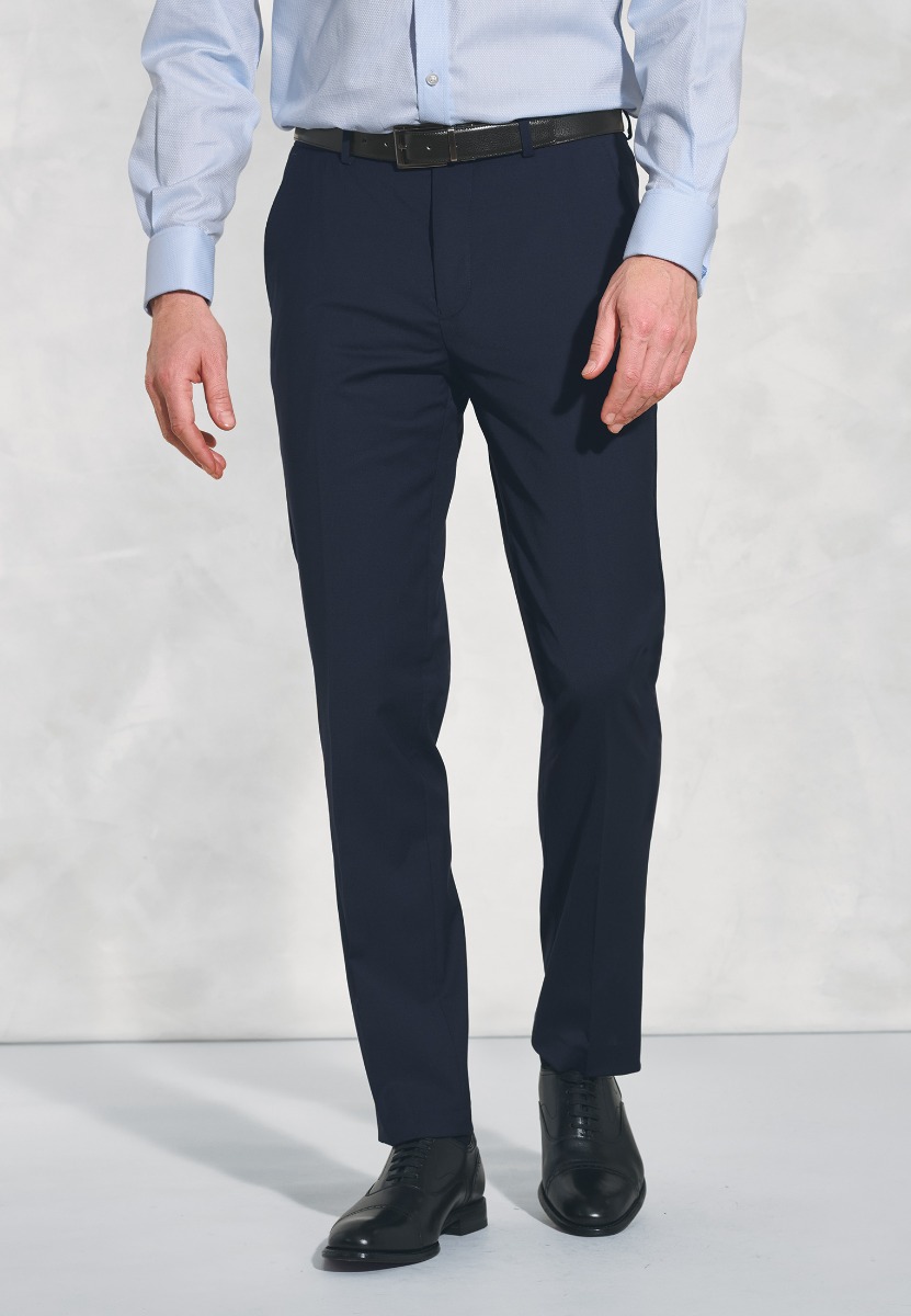 Trousers: Tailored fit. 270g. Half lined. Flat front. Belt loops. Comfort waistband. Clasp fastening with French bearer. Slant pockets. One rear pocket with button fastening. Pressed crease. Machine washable.