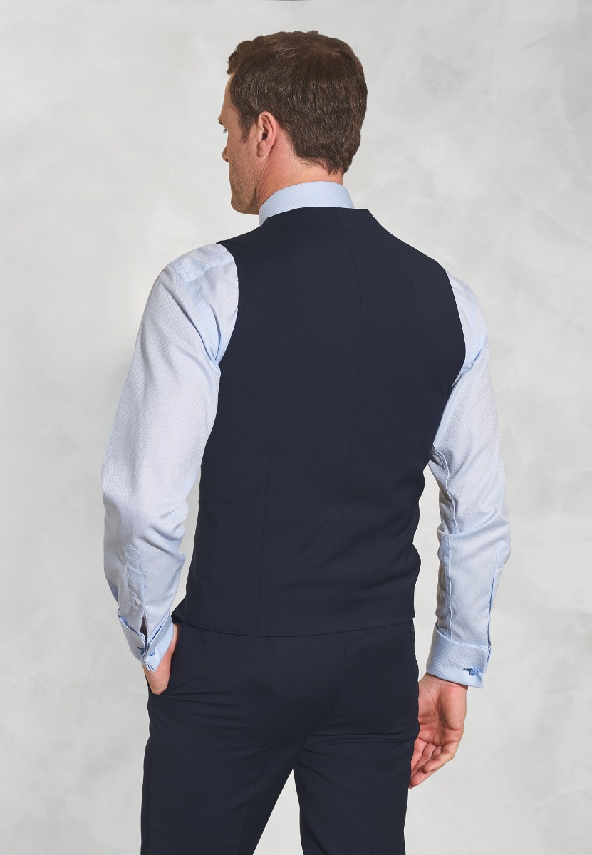 Waistcoat: Tailored fit. 270g. Single breasted. Five button front. Two welt pockets. Cloth backed. No back strap or buckle. Machine washable.