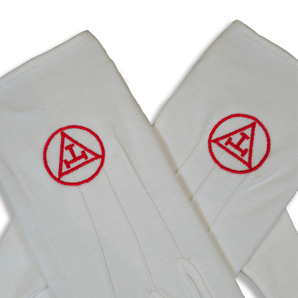A pair of cotton gloves with an embroidered Triple Tau Motif in Red